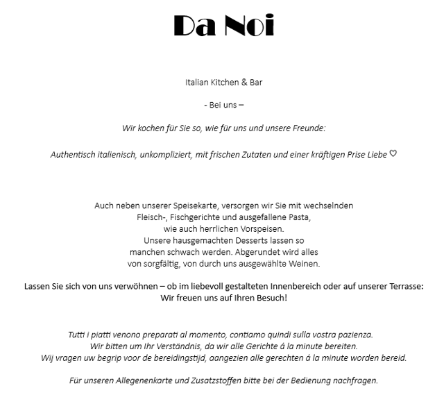 Ausserhaöb unsere feste menü, führen wir ein Tagesmenü, mit verschiedensten Vorspeisen, Pastas & Hauptspeisen wie auch Desserts & Weineangebote.